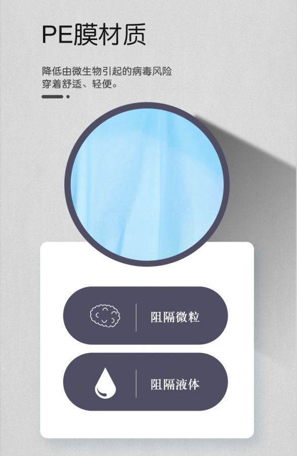產(chǎn)品性能:長(zhǎng)袖,大拇指袖口、降低由微生物引起的病毒風(fēng)險(xiǎn)、穿著舒適,輕便,防水。